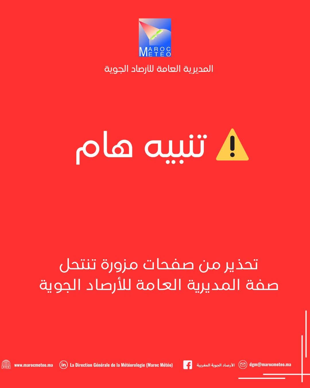 على غير عادتها وبدل إصدار نشرة إنذارية، أصدرت المديرية العامة للأرصاد الجوية بيانا وصفته بالهام تنهي من خلاله إلى علم العموم أنها رصدت مجموعة من الصفحات والحسابات الوهمية على موقع التواصل الاجتماعي فيسبوك، والتي تنتحل اسمها وتستخدم شعارها الرسمي لنشر معلومات مغلوطة أو لجمع بيانات المواطنين عبر أرقام هواتف غير رسمية.