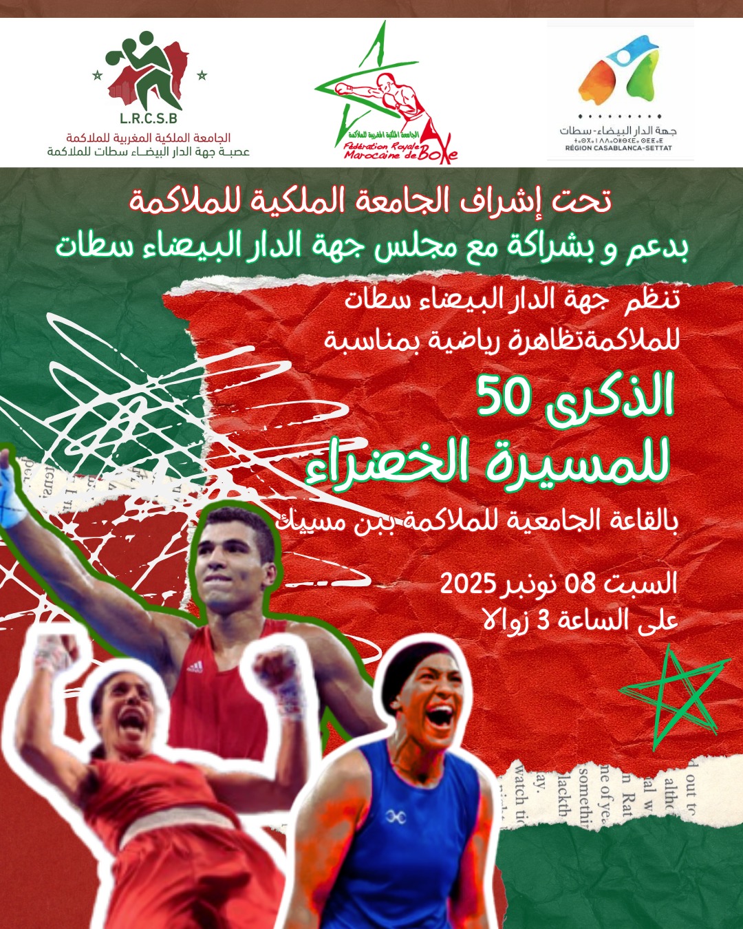 تنظم عصبة جهة الدار البيضاء سطات للملاكمة، تحت إشراف الجامعة الملكية المغربية للملاكمة، وبدعم وشراكة مع مجلس جهة الدار البيضاء سطات، تظاهرة رياضية كبرى تخليدا للذكرى الخمسين لانطلاق المسيرة الخضراء المظفرة. وستقام هذه الفعالية يوم السبت 8 نونبر 2025 بالقاعة المغطاة الجامعية للملاكمة التابعة للمركب الرياضي ابن مسيك بمدينة الدار البيضاء، بمشاركة نخبة من أجود الملاكمين والملاكمات المنتمين إلى الجمعيات الرياضية بالجهة.