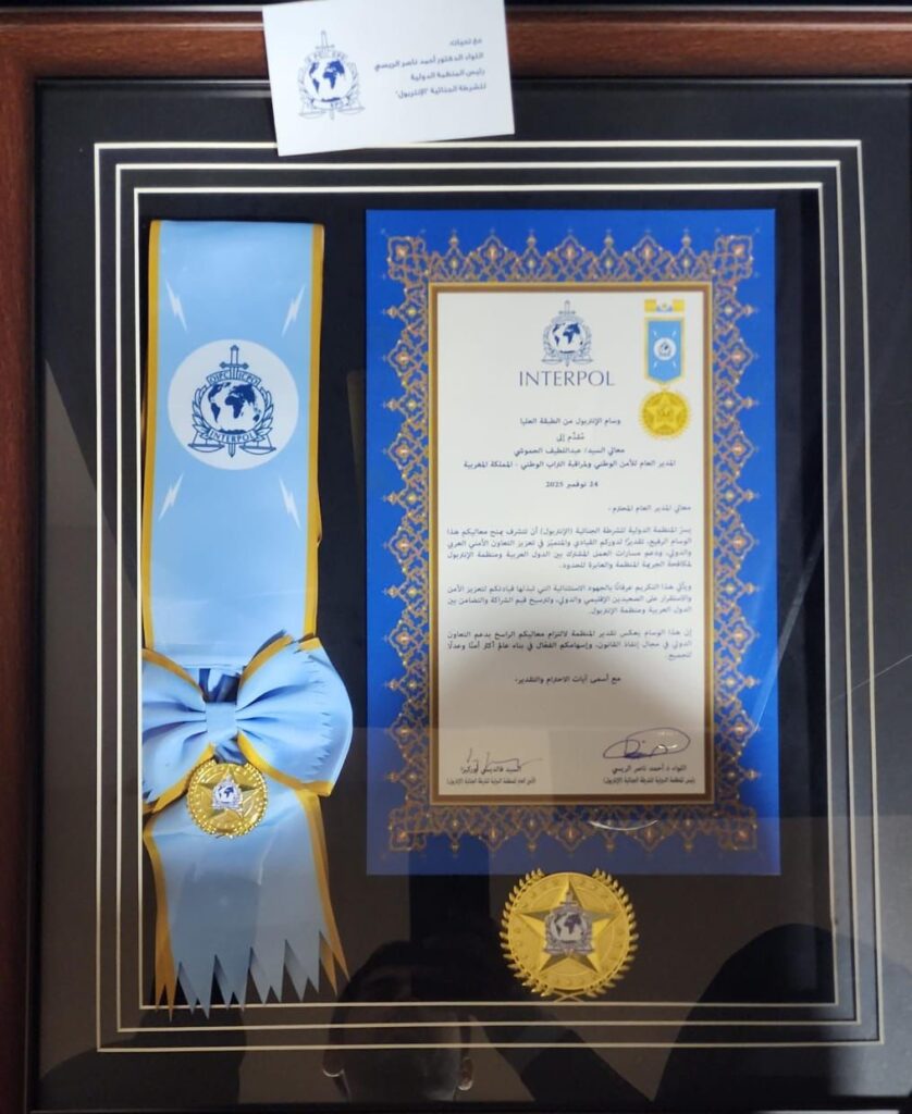 وشّحت المنظمة الدولية للشرطة الجنائية أنتربول عبد اللطيف حموشي، المدير العام للأمن الوطني ولمراقبة التراب الوطني، بوسام الأنتربول من الطبقة العليا، الذي يعد أرفع وسام تصدره المنظمة لسامي الشخصيات الدولية.