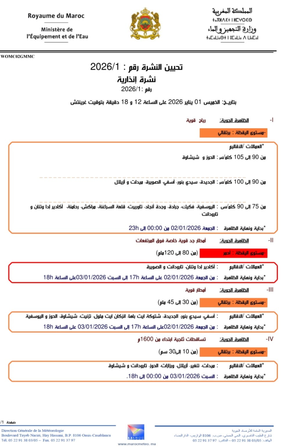 نشرة إنذارية من المستوى الأحمر بأقاليم أكادير وتارودانت والصويرة