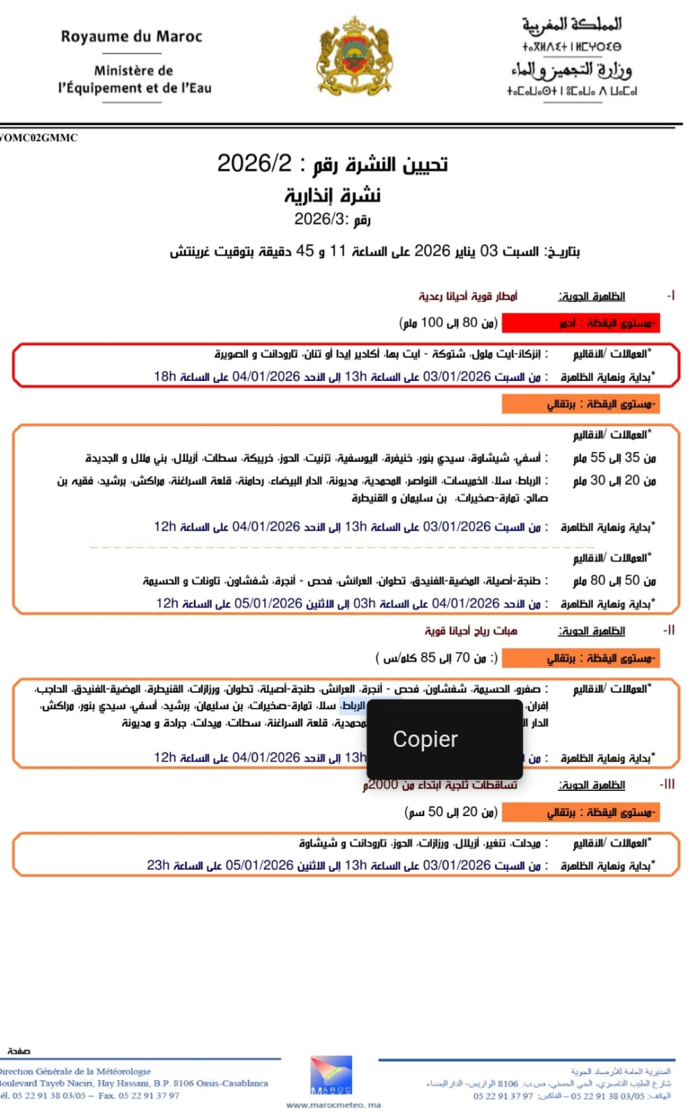 جرى صباح اليوم السبت تحيين النشرة الإنذارية الصادرة عن المديرية العامة للأرصاد الجوية.